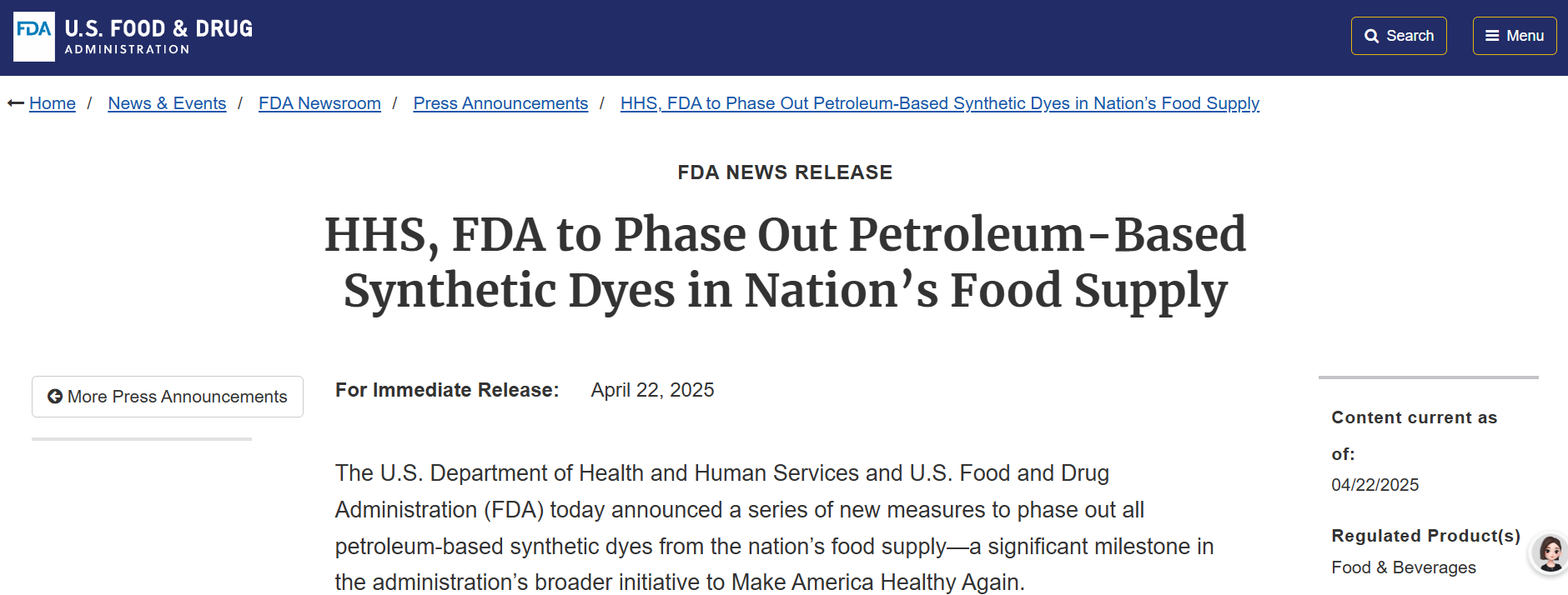 •FDA:HHS, FDA to Phase Out Petroleum-Based Synthetic Dyes in Nation’s Food Supply