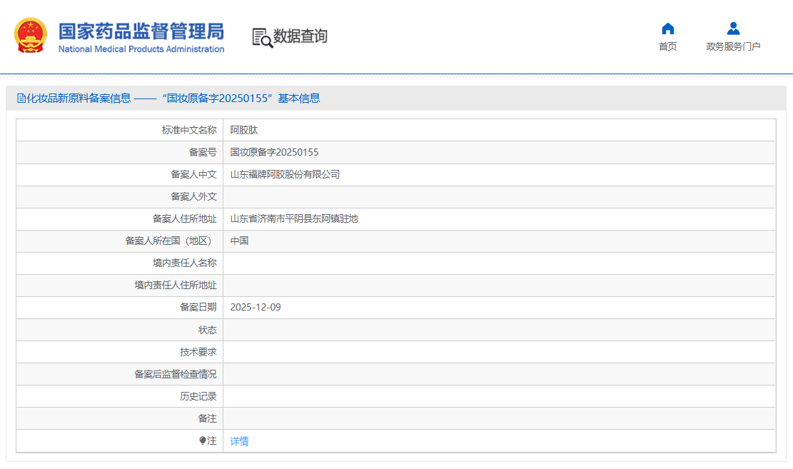 阿胶肽(备案号:国妆原备字20250155),由山东福牌阿胶股份有限公司备案。目前相关技术要求尚未披露,且尚未进入监测期。