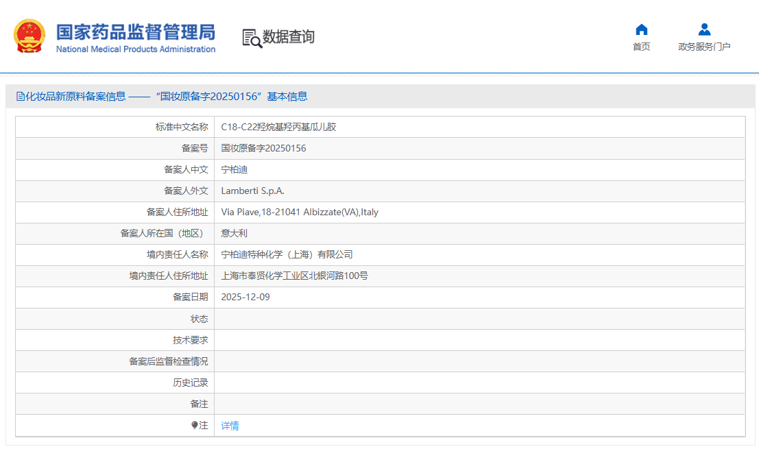 C18-C22羟烷基羟丙基瓜儿胶(备案号:国妆原备字20250156),由宁柏迪备案。目前相关技术要求尚未披露,且尚未进入监测期。