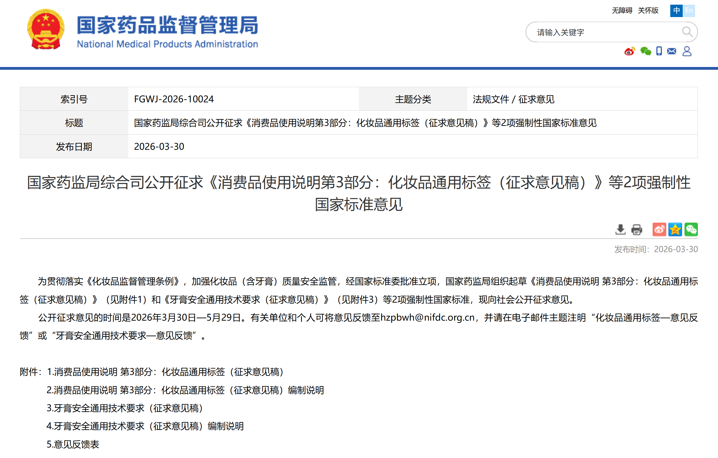 公开征求意见的时间是2026年3月30日—5月29日。有关单位和个人可将意见反馈至hzpbwh@nifdc.org.cn,并请在电子邮件主题注明“化妆品通用标签—意见反馈”或“牙膏安全通用技术要求—意见反馈”。