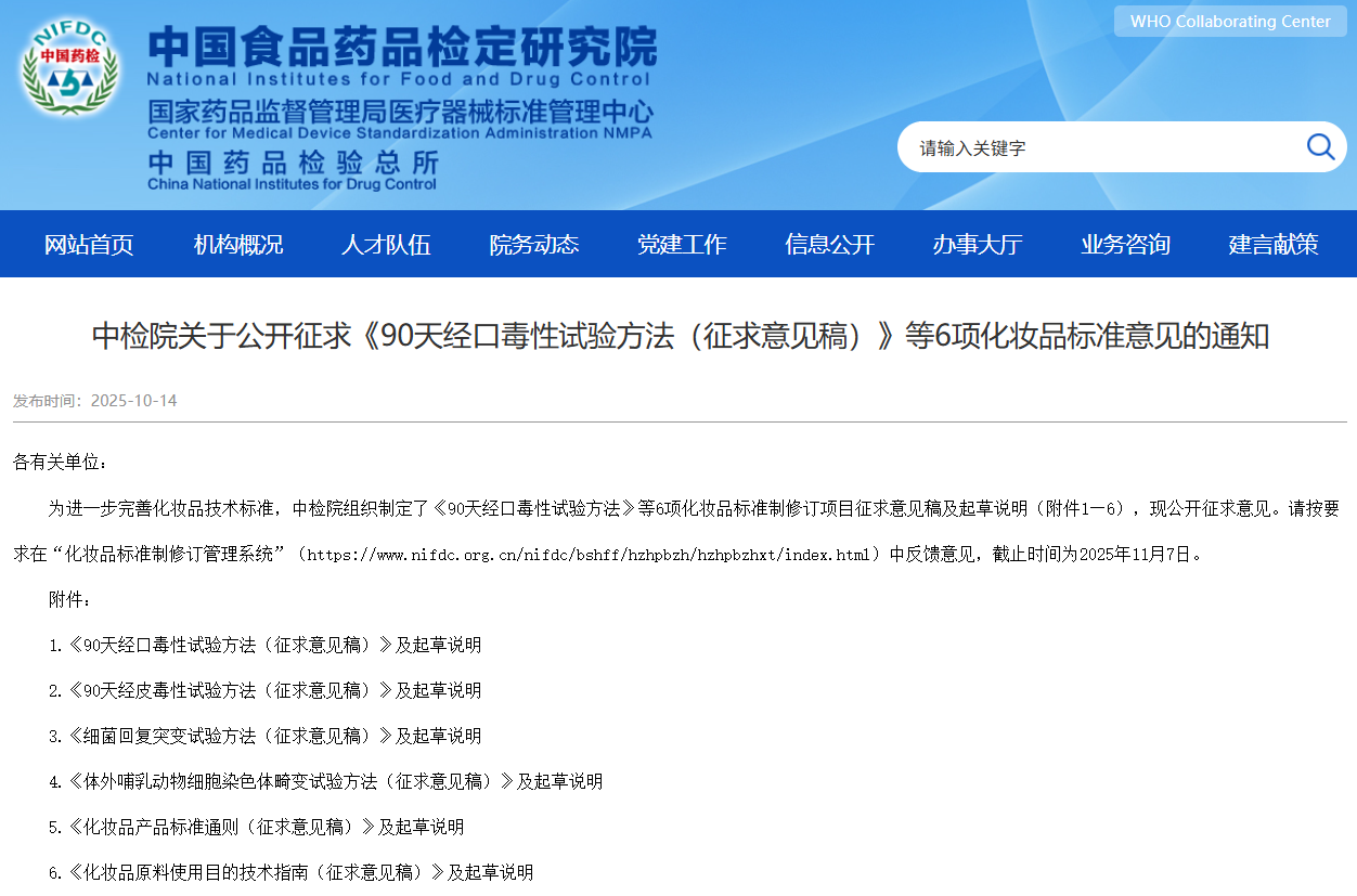 2025年10月14日,中检院组织制定了《化妆品原料使用目的技术指南(征求意见稿)》及起草说明 ,为规范填报原料使用目的提供技术参考。