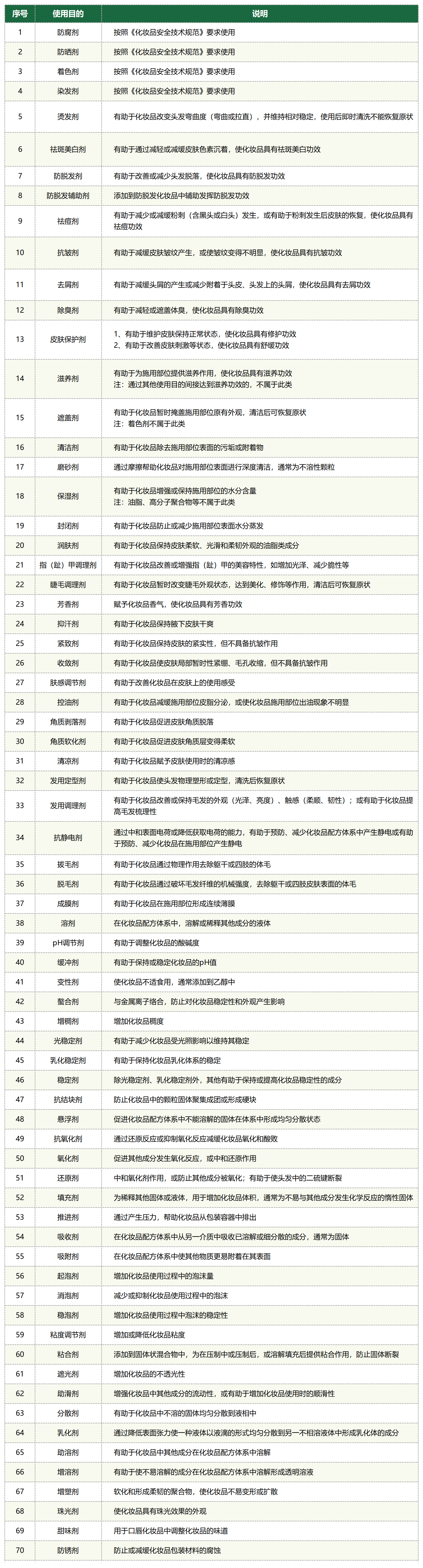 主要为注册人、备案人在化妆品或化妆品新原料注册备案时,填报原料使用目的提供参考。