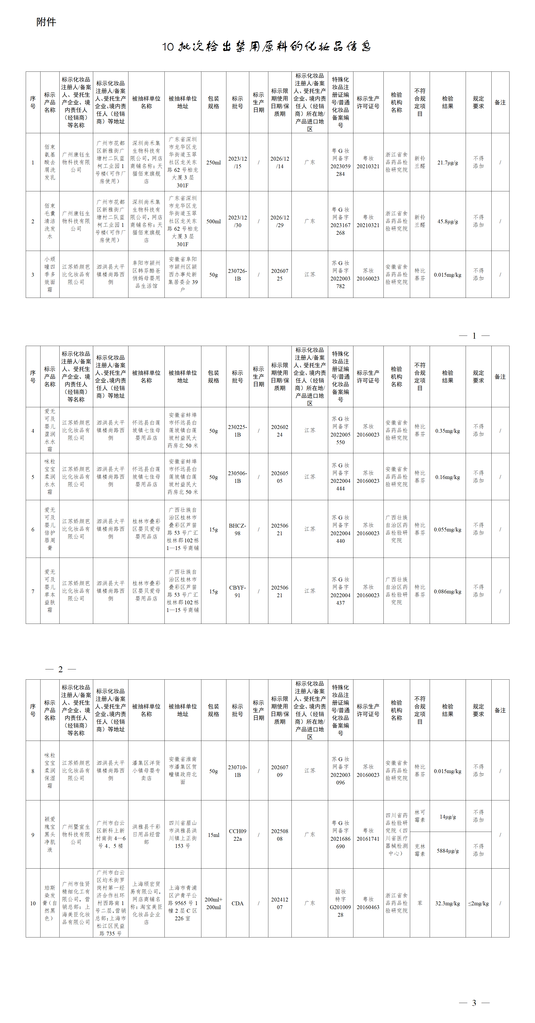2025年4月27日,国家药监局官网发布《关于10批次化妆品检出禁用原料的通告(2025年第16号)》,通告显示,产品标签标示名称为佰束氨基酸去屑洗发乳等10批次化妆品不符合规定,检出《化妆品安全技术规范(2015年版)》中规定的禁用原料。禁用原料包括:新铃兰醛、特比萘芬、林可霉素、克林霉素和苯。