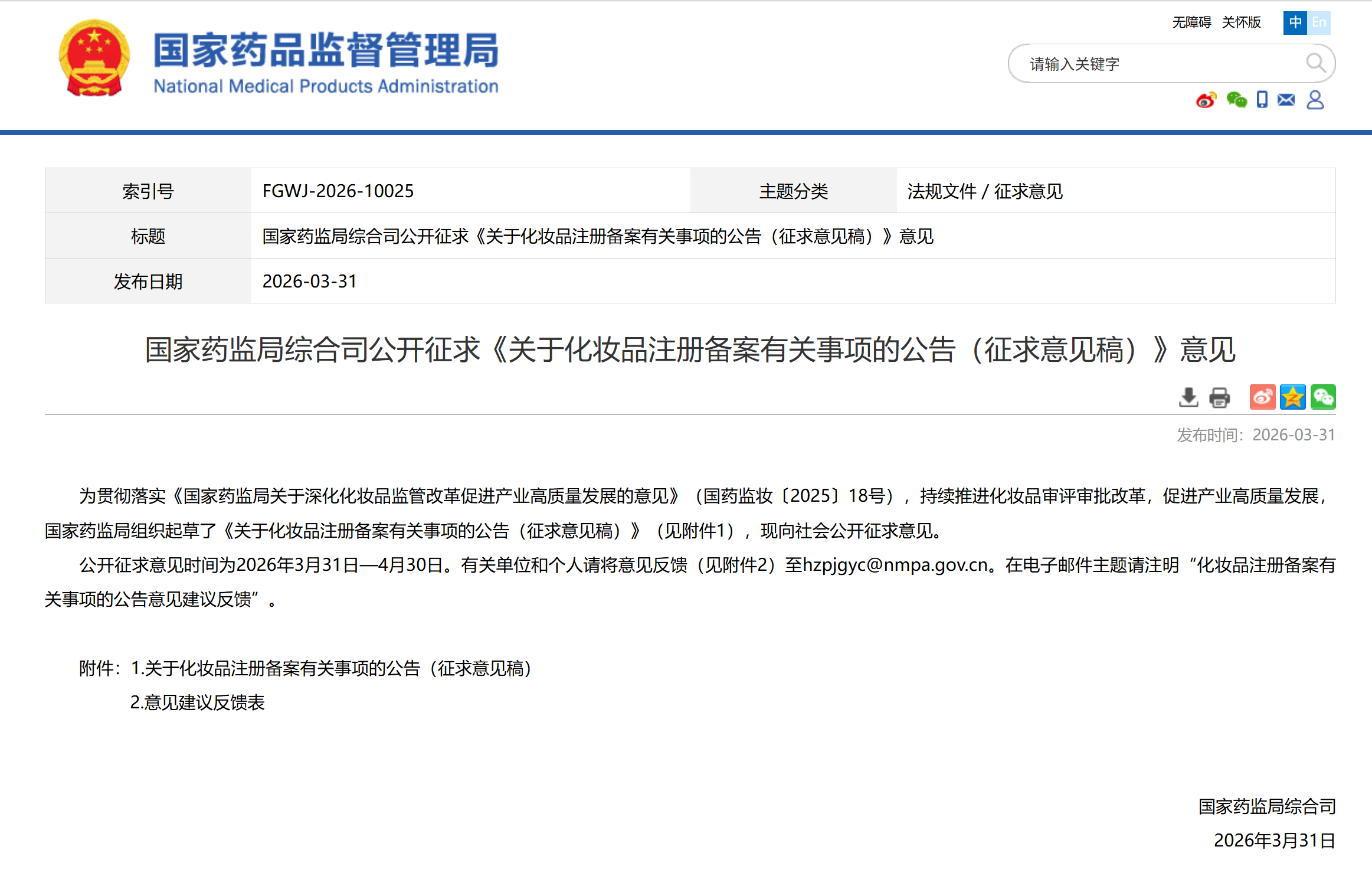 公开征求意见时间为2026年3月31日—4月30日。有关单位和个人请将意见反馈(见附件2)至hzpjgyc@nmpa.gov.cn。在电子邮件主题请注明“化妆品注册备案有关事项的公告意见建议反馈”。