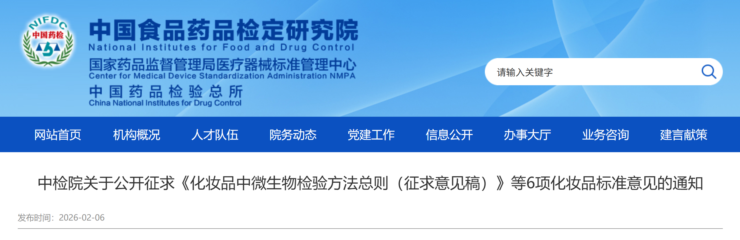 为进一步完善化妆品技术标准,中检院组织制定了《化妆品中微生物检验方法总则》等6项化妆品标准制修订项目征求意见稿(附件1—6),现公开征求意见。请按要求在“化妆品标准制修订管理系统”(https://www.nifdc.org.cn/nifdc/bshff/hzhpbzh/hzhpbzhxt/index.html)中反馈意见,截止时间为2026年3月22日。